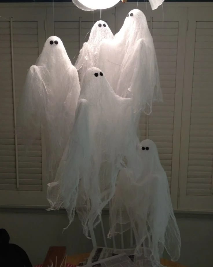 For a bolder statement, consider creating floating ghosts that go beyond the minimal sheer drape. Think oversized figures that hang dramatically from high ceilings, or smaller “mini-ghosts” suspended in clusters for a playful effect. By giving each ghost slight variations—longer drapes, tilted “heads,” or layered fabrics—you create the impression of a haunted gathering frozen midair.