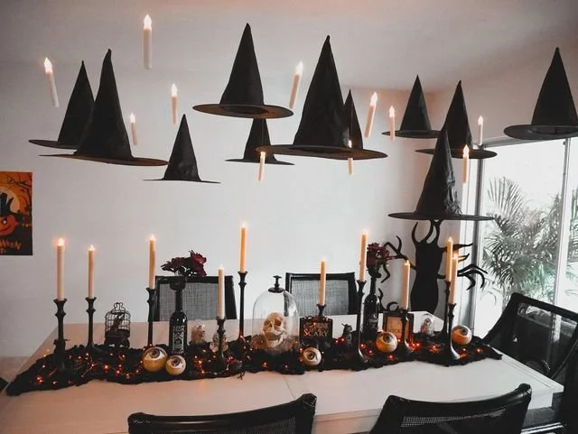 If you’re looking to add a playful yet stylish element, floating witch hats are a must. Lightweight and inexpensive, they make a striking statement when suspended at varying heights. Use black fishing line for a “floating” illusion, and cluster them together above an entryway or dining space.