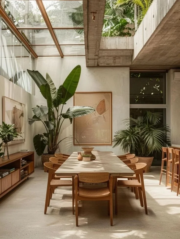 Real-life example: The home of celebrity designer Kelly Wearstler in California utilizes natural light to dramatic effect. Large glass walls open the interiors to the outdoor landscape, creating a seamless flow between the indoors and the expansive garden. The result is a space filled with light, greenery, and fresh air—perfectly embodying biophilic principles.