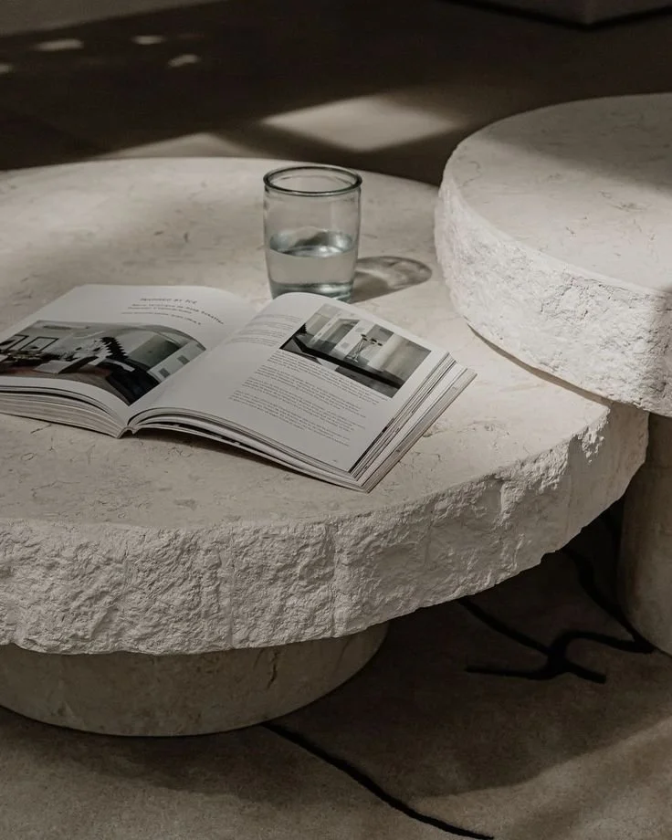 Rounded, sculptural furniture in soft, organic shapes feature prominently. Often living rooms boast a large, curved sectional sofa and circular coffee tables, bringing a sense of flow and softness that echoes the natural world.